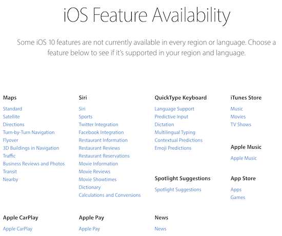 Apple hat inzwischen den Golden Master Build von iOS 10 an seine Entwickler verteilt. Die allgemeine Freigabe erfolgt dann am Dienstag kommender Woche gegen 19:00 Uhr unserer Zeit. Damit wird das neue Betriebssystem dann für alle iPhones ab dem iPhone 5 aufwärts, für alle iPads ab dem iPad der 4. Generation aufwärts, für alle iPad mini ab dem iPad mini 2 aufwärts und für den aktuellen iPod touch der 6. Generation zur Verfügung stehen, wobei nicht alle neuen Funktionen auch auf allen Geräten verfügbar sein werden. Doch nicht nur die Geräte-Generation wirkt einschränkend auf die zur Verfügung stehenden neuen Funktionen, auch das Land in dem das Gerät eingesetzt wird, hat hier Auswirkungen. Dies war bei iOS 9 so, dies ist auch bei iOS 10 so. Auf einer extra geschalteten Sonderseite klärt Apple inzwischen über die länderspezifischen Einschränkungen der neuen Funktionen von iOS 10 auf. Aufgeteilt in verschiedene Themengebiete lassen sich dabei die verschiedenen Funktionen anklicken, woraufhin sich die Liste der Länder in denen die Funktion zur Verfügung steht öffnet. Für Deutschland bestehen aber meines Wissens nach und auch nach einer kurzen Stichprobe ohnehin ebenso wenig Einschränkungen, wie auch für unsere Nachbarländer Österreich und Schweiz.