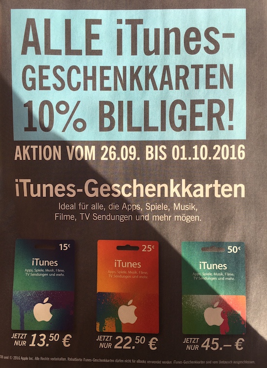Achtung: Leider kann ich die Hinweise auf die günstigen iTunes-Karten nicht in jedem einzelnen Fall überprüfen. Checkt daher bitte vorher noch einmal ab, ob die jeweilige Filliale den Rabatt auch tatsächlich gewährt!