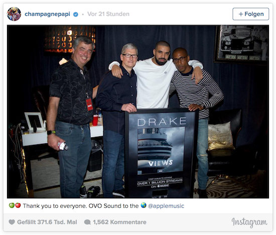 Neben dem vorhin bereits thematisierten Interview zu Apple Music gibt es aus der vergangenen Nacht noch eine weitere News zu Apples Musik-Streamingdienst. So überschritt das Album "Views" des kanadischen Rappers Drake einen bemerkenswerten Meilenstein und wurde das erste Album, welches über eine Milliarde Mal auf Apple Music gestreamt wurde. Dies teilte Drake selbst in einem entsprechenden Post auf Instagram mit, wo er ein gemeinsames Foto mit Apple CEO Tim Cook, iTunes Chef Eddy Cue und Larry Jackson veröffentlichte, die ihm die frohe Kunde und ein entsprechend gerahmtes Bild überreichten.