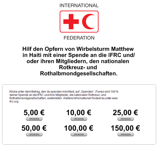 Die meisten werden es in den Medien über die vergangenen Tage verfolgt haben. In Haiti hat vor einigen Tagen der Hurrikan "Matthew" schwere Verwüstungen angerichtet und mehreren hundert Menschen das Leben gekostet. Weitere mehrere 1.000 Menschen wurden durch den Wirbelsturm verletzt oder obdachlos. Wie auch schon bei Naturkatastrophen in der Vergangenheit bietet Apple auch dieses Mal wieder eine Sonderseite im iTunes Store an, über die alle User die Möglichkeit haben, Geldbeträge in unterschiedlicher Höhe für die Hurrikanopfer in Haiti zu spenden. Dabei hat man die Wahl zwischen sechs Beträgen zwischen € 5,- und € 150,-, welche dem weltweiten Rotkreuz- und Rothalbmond-Netzwerk in voller Höhe zu Gute kommen. Auch im mobilen iTunes Store ist die Sonderseite verfügbar. Der Kauf einer Spende wird auf der Abrechnung als normale iTunes-Transaktion aufgeführt, eine Spendenquittung also nicht ausgestellt. Dies sollte aus meiner Sicht jedoch nicht davon abhalten, die arg gebeutelten Regionen zumindest mit einem kleinen Betrag zu unterstützen. Ich rufe hiermit alle Besucher und Leser meiner Seite dringend auf, sich an der genannten oder einer anderen Spendenaktion für die Opfer zu beteiligen. Vielen Dank!