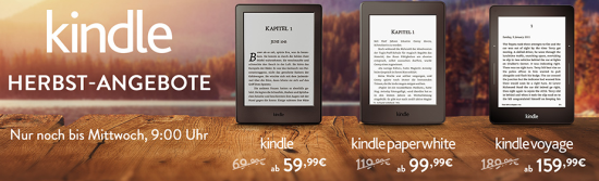Ein Blick aus dem Fenster nach draußen lässt keine Zweifel mehr offen: Es ist Herbst! Und das bedeutet kürzere Tage, ungemütliche Wochenenden und viel Zeit zum Lesen. Diese Umstand nimmt der Internet-Versandhändler Amazon nun zum Anlass, um eine Rabattaktion für seine Kindle E-Book Reader zu lancieren. Dabei können noch bis kommenden Mittwoch um 09:00 Uhr drei Mitglieder aus der Kindle-Familie zu vergünstigten Preisen erworben werden. Wer es sich also diesen Herbst öfter mal auf dem heimischen Sofa gemütlich machen und ein gutes Buch lesen möchte, bekommt nun die Gelegenheit, sich die passende Hardware dazu zu besorgen. Die folgenden Kindles sind dabei derzeit günstiger zu haben: