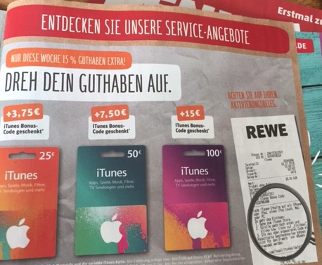 Die neue Woche beginnt mal wieder mit einem interessanten Angebot für alle Schnäppchenjäger: Es gibt wieder vergünstigte iTunes-Geschenkkarten. So sind es dieses Mal die Filialen der Supermarktkette REWE, die die Karten zum Sonderpreis verkaufen. Dort erhält man dabei in dieser Woche einen Rabatt in Form von einem Extra-Guthaben in Höhe von 15% des Kaufpreises der iTunes-Geschenkkarten mit einem aufgedrucketen Wert von € 25,-, € 50,- oder € 100,-. Den Zusatzcode findet man nach dem Kauf auf dem Kassenbeleg. Aber Achtung: Die Aktion gilt nur bis Samstag, den 22. Oktober 2016, bzw. solange der Vorrat reicht. Die Anzahl der Karten pro Kauf ist anscheinend nicht begrenzt. Man sollte also im Zweifel schnell sein, um noch rechtzeitig zuschlagen zu können. Schließlich haben die Karten ja kein Verfallsdatum. Der aufgedruckte Wert der Karten und das Zusatz-Guthaben können sowohl für Musik, als auch für Fernsehserien, Filme und Einkäufe im Mac- und iOS-AppStore genutzt werden. (mit Dank an Ralf!)