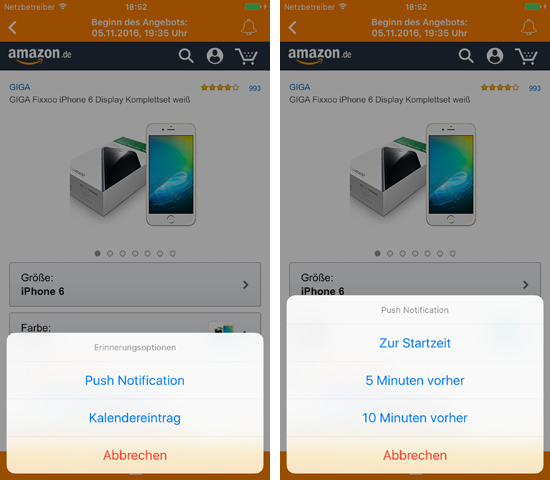 Hierüber hat man Zugriff auf sämtliche Blitzangebote des Tages (auch die, die bereits gestartet sind) und kann sich für diese Angebote direkt eine Erinnerung erstellen. Wahlweise kann dies auf Basis einer Push Notification geschehen oder auch über einen Eintrag im iOS-Kalender. Dabei hat man die Wahl, ob man zur Startzeit des Angebots informiert werden möchte oder bereits 5 oder 10 Minuten vorher. Für zusätzlichen Komfort sorgen ein Direktzugriff auf Kategorie-Ebene, eine eigene Zusammenstellung von Artikeln aus bestimmten Kategorien und die Möglichkeit, sämtliche Blitzangebote nach Stichworten wie Marken oder Produktbezeichnungen zu durchsuchen. Die App ist natürlich komplett kostenlos, sollte der Kauf eines Produkts über die App erfolgen, geschieht dies über Affiliate-Links.