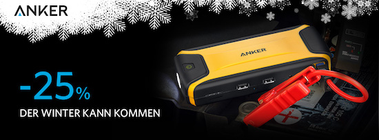 Ein Blick aus dem Fenster oder auch auf das Thermometer macht es deutlich: Der Winter steht vor der Tür. Inzwischen dürften die meisten hoffentlich ihre Winterreifen aufgezogen und ihr Auto auch ansonsten Winterfest gemacht haben. Was aber immer mal passieren kann ist das die Batterie ob der kalten Temperaturen ihren Geist aufgibt. In solchen Momenten bewährt es sich, ein Starthilfe-Ladegerät dabei zu haben, mit dem man der Batterie den nötigen Schwung verschaffen kann. Passend zur Saison hat der beliebte Gadget-Anbieter Anker daher heute noch einmal eine Rabattaktion für sein Auto Starthilfe-Ladegerät mit 400A Spitzenstrom, integrierter 10.000 mAh Powerbank, höherem Sicherheitsschutz und eingebauter LED Taschenlampe aufgelegt.