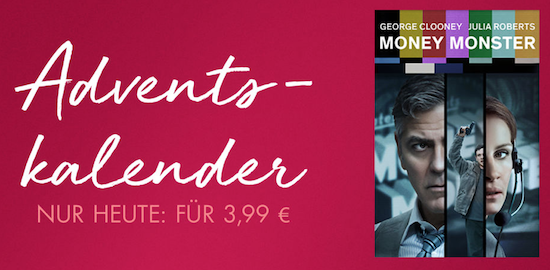 Apple versüßt allen Filmfans den diesjährigen Dezember mit einer besonderen Aktion im deutschen iTunes Store. In Form eines "Adventskalenders" wird dabei bis zum 24. Dezember jeden Tag ein neuer Film im iTunes Store für 24 Stunden auf lediglich noch € 3,99 im Preis gesenkt. Hierfür erhält man dann die Kaufversion des Titels in HD-Qualität. Am heutigen Tag der Aktion handelt es sich dabei um den Thriller Money Monster (€ 3,99 im iTunes Store) mit George Clooney und Julia Roberts. Selbst wenn man aktuell keine Zeit hat, sich den Streifen zu Gemüte zu führen, kann ein Zuschlagen bei diesem Preis nicht schaden. Da es sich um die Kaufversion handelt, kann man den Film nach dem Kauf schauen wann man will und ihn auch jederzeit aus iCloud erneut kostenlos herunterladen. Viel Spaß!