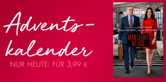 Apple versüßt allen Filmfans den diesjährigen Dezember mit einer besonderen Aktion im deutschen iTunes Store. In Form eines "Adventskalenders" wird dabei bis zum 24. Dezember jeden Tag ein neuer Film im iTunes Store für 24 Stunden auf lediglich noch € 3,99 im Preis gesenkt. Hierfür erhält man dann die Kaufversion des Titels in HD-Qualität. Am heutigen Tag der Aktion handelt es sich dabei um die Komödie Man lernt nie aus (€ 3,99 im iTunes Store) mit Robert de Niro und Anne Hathaway. Selbst wenn man aktuell keine Zeit hat, sich den Streifen zu Gemüte zu führen, kann ein Zuschlagen bei diesem Preis nicht schaden. Da es sich um die Kaufversion handelt, kann man den Film nach dem Kauf schauen wann man will und ihn auch jederzeit aus iCloud erneut kostenlos herunterladen. Viel Spaß!