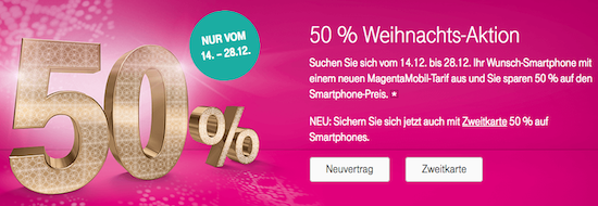 Kurz vor Weihnachten startet die Telekom traditionell noch einmel eine Aktion, bei der man 50% Rabatt auf sämtliche Smartphones im Angebot des Mobilfunkanbieters erhält. Hierfür ist wie gehabt der Abschluss eines neuen Laufzeitvertrag über 24 Monaten erforderlich. In diesem Jahr gilt das Angebot allerdings auch für Zweitkarten. Bei den Verträgen hat man die Wahl zwischen den Tarifen MagentaMobil S bis MagentaMobil L Plus, Premium sowie sämtlichen Friends-Varianten. Auf diesem Wege kann man auch bei den aktuellen iPhones teils kräftig gegenüber dem ansonsten ausgewiesenen Preisen für die Hardware-Zuzahlung sparen. So bekommt man ein iPhone 7 beispielsweise im Tarif MagentaMobil L+ für lediglich noch € 0,50 Zuzahlung. Im günstigsten Tarif MagentaMobil S bekommt man es hingegen, je nach Speicherkapazität bereits für € 149,-, € 199,97 bzw. € 249,98. Beim iPhone 7 Plus mit seiner Dual-Lens-Kamera zahlt man in diesem kleinsten Tarif ab € 224,97 für das Gerät. In den teureren Tarifen lässt sich dieser Preis noch auf € 74,97 drücken. Angeboten werden von Apple in der Aktion neben dem iPhone 7 und iPhone 7 Plus auch noch das iPhone 6s, iPhone 6s Plus, iPhone SE, iPad mini 4, iPad Air 2 und das iPad Pro in beiden Größenvarianten. Die Aktion läuft noch bis zum 28. Dezember 2018. Ein Klick auf den folgenden führt direkt zu den Aktionsseiten bei der Telekom.