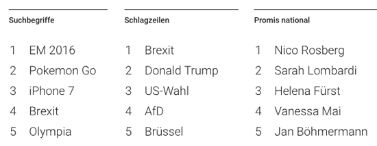 Jahr für Jahr veröffentlicht Google seinen Bericht über die am häufigsten getätigten Suchanfragen des Jahres. Dies ist nun auch für das Jahr 2016 geschehen. In den sogenannten Trending-Listen war dabei auch in diesem Jahr wieder Apple mit seinem iPhone vertreten. Das iPhone 7 konnte dabei in diesem Jahr den 3. Platz belegen, hinter der Fußball-Europameisterschaft und dem Mega-Spiel Pokémon Go. Bei den Schlagzeilen des Jahres dominierte erwartungsgemäß der Brexit vor dem designierten US-Präsidenten Donald Trump und bei den nationalen Promis konnte der frischgebackene und auch schon wieder zurückgetretene Formel 1 Weltmeister Nico Rosberg auf der Zielgeraden noch Sarah Lombardi abfangen. Sämtliche, auch noch weiter heruntegrochene Statistiken lassen sich in Googles Jahresrückblick 2016 einsehen.