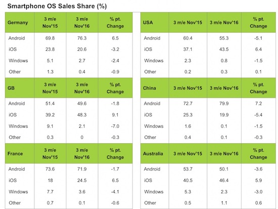 Interessant ist auch die Entwicklung bei den Anteilen der mobilen Betriebssysteme. So konnte Apples iOS im oben genannten Zeitraum in den USA um 6,4% zulegen und liegt dort nun bei 43,5% Marktanteil. Im selben Zeitraum büßte Android 5,1% ein, liegt aber mit einem Marktanteil von 55,3% nach wie vor an der Spitzer in den USA. Nichts desto trotz musste Android damit nun zum sechsten Mal in Folge einen Rückgang beim Marktanteil hinnehmen. In Deutschland zeichnet sich hingegen ein anderes Bild. Hierzulande konnte Android um 6,5% zulegen, während iOS 3,2% Marktanteil gegenüber dem Vorjahr verlor. Hiermit bilden wir allerdings gemeinsam mit China die Ausnahme unter den untersuchten Märkten.