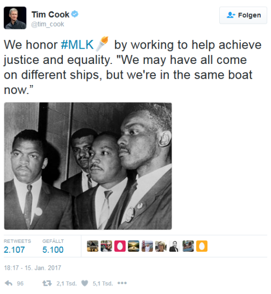 Wie viele andere US-Unternehmen bietet auch Apple seinen Mitarbeitern in den USA am Martin Luther King Day an, statt zur Arbeit zu erscheinen, freiwillige Stunden für ein soziales Projekt zu leisten. Für jeden Mitarbeiter, der trotzdem ins Büro kommt, spendet Apple pro geleisteter Arbeitsstunde 50,- US-Dollar für wohltätige Zwecke im Rahmen des sogenannten "Gift Matching"-Programms. Ebenfalls Teil dieses Programms ist eine Verdoppelung sämtlicher Mitarbeiter-Spenden an wohltätige Einrichtungen durch Apple. Und auch Tim Cook wies via Twitter heute noch einmal auf die Bedeutung Martin Luther Kings und dessen Erbe hin: