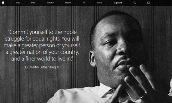 In den USA findet (wie an jedem dritten Montag im Januar) heute der "Martin Luther King Day" statt. Anlässlich dieses Umstandes hat Apple die Startseite seiner Internetpräsenz in den USA dem 1968 erschossenen Bürgerrechtler und Freiheitskämpfer gewidmet. Vor einem großen Bild von Luther King sind dazu die Worte "Commit yourself to the noble struggle for equal rights. You will make a greater person of yourself, a greater nation of your country, and a finer world to live in." zu lesen. Apple hat eine lange Vergangenheit, nicht nur im Kampf gegen die ungleiche Behandlung von Minderheiten, sondern auch in der Verbindung zu Martin Luther King. So war dieser unter anderem Teil der 1997 ins Leben gerufenen, legendären "Think Different"-Kampagne, die neben dem Bürgerrechtler auch Persönlichkeiten wie Albert Einstein, Bob Dylan, den Dalai Lama und John Lennon zeigte.