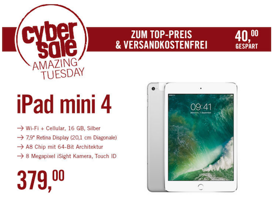 Auch am heutigen Dienstag lockt der Apple-Händler Cyberport wieder mit einem spannenden Angebot in seinem Cybersale. Dort lässt sich aktuell und nur in begrenzter Stückzahl von 50 Exemplaren das aktuelle iPad mini 4 in der Variante WiFi + LTE und 16 GB Speicherplatz in Silber für nur € 379,- erwerben. Damit liegt der aktuelle Preis um € 40,- unter den normalerweise veranschlagten € 419,-. Der Rabatt wird erst am Endes, kurz vor dem abschließenden Bezahlvorgang abgezogen, also nicht wundern, wenn zunächst noch der reguläre Preis angezeigt wird. Wie gehabt, verlangt Cyberport darüber hinaus auch keine Versandkosten für den Standardversand. Neben der Begrenzung der Geräte in dieser Aktion auf 50 Stück gilt dieses Angebot noch bis morgen früh um 09:00 Uhr. Eventuell handelt es sich hierbei um eine der letzten Gelegenheiten das aktuelle iPad mini günstig zu bekommen. Gerüchtehalber soll Apple das Gerät noch in diesem Jahr einstellen. Der folgende Link führt direkt zur Angebotsseite bei Cyberport: iPad mini 4 im Cyberdeal