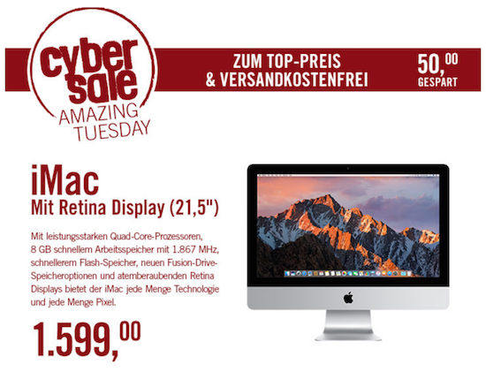 Irgendwann demnächst, eventuell sogar schon auf dem erwarteten März-Event dürfte Apple einen neuen iMac präsentieren. Immerhin datiert das aktuelle Modell bereits aus dem Herbst 2015. Damals hatte Apple das Retina-Display auch erstmals im Modell mit der 21,5" Bildschirmdiagonalen angeboten. Dieses nach wie vor aktuelle Modell kann man nun heute beim Apple-Händler Cyberport zum Sonderpreis erstehen. Wer also eher auf den Geldbeutel achtet und nicht unbedingt das Top-Modell daheim stehen haben muss, für den könnte dieses Angebot durchaus interessant sein. Im Cybersale zahlt man heute nämlich lediglich € 1.599,- für das Gerät, während im Apple Online Store derzeit € 1.819,- aufgerufen werden. In dem Gerät verbaut sind ein 1 TB Fusion Drive, ein 3,1 GHz Quad-Core Intel Core i5 Prozessor und 8 GB Arbeitsspeicher. Im Lieferumfang enthalten sind zudem die Magic Mouse 2 und das Magic Keyboard.