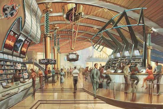 Die Kollegen von Fast Company haben ein Interview mit dem damaligen Projektleiter, dem ehemaligen Disney-Zeichner Tony Christopher zu dem Thema geführt und 512pixels hat passend dazu ein paar nette Konzeptzeichnungen zur Gestaltung der Apple Cafes veröffentlicht, die ich euch nicht vorenthalten möchte. Mich erinnert das Ganze beim Betrachten irgendwie an das 80er Jahre Cafe in "Zurück in die Zukunft 2". Und das meine ich mit jeder Silbe positiv! Ich find's geil! :-)