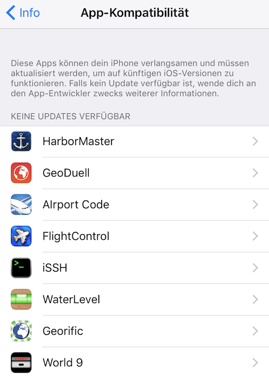 Unter iOS 10.3 kann man sich die auf dem eigenen Gerät installierten und betroffenen Apps übrigens bereits anzeigen lassen. Hierzu geht man in den Einstellungen in den Bereich "Allgemein > Info" und dort dann auf die Zeile "Apps".