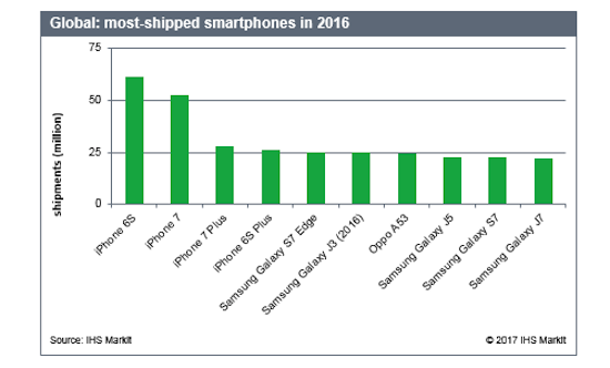 Stimmen die Zahlen der Marktbeobachter von IHS Markit, war das iPhone das beliebteste Smartphone des vergangenen Jahres. So haben die Analysten ermittelt, dass das iPhone 6s das meistverkaufte Smartphone im Jahr 2016 war, dicht gefolgt von iPhone 7, iPhone 7 Plus und iPhone 6s Plus. Dabei beruft sich IHS Markit auf die hauseigene Datenbank, in der die Smartphone-Absätze von über 350 Modellen quartalsweise erfasst werden. Erst auf dem fünften Platz folgt mit dem Samsung Galaxy S7 Edge das erste Gerät eines Konkurrenten. Komplett in der Liste fehlt (wenig überraschend) das von dem Akku-Debakel geplagte Samsung Galaxy Note7. Die Tatsache das Apple so deutlich vor Samsung liegt, ist dennoch mehr als bemerkenswert, bedenkt man, dass die Flaggschiffe der Koreaner, das Galaxy S7 und das Galaxy S7 Edge, bereits im März 2016 auf den Markt kamen und damit ziemlich genau ein halbes Jahr vor dem iPhone 7 und dem iPhone 7 Plus.