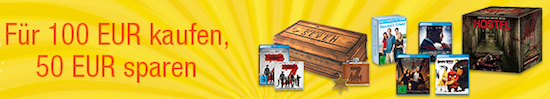 Heute Nachmittag gab es traditionell den Blick in die Filmsektion des iTunes Store und dort auf die aktuell günstigen und neuen Filme, die Apple dort anbietet. Wer noch mehr sparen möchte, kann aktuell auch noch beim Konkurrenten Amazon vorbeischauen. Dort gibt es heute zwar nicht den alle vier Wochen angebotenen "Filmeabend", dafür aber eine Sonderaktion, bei der man bis zu 50% des Kaufpreises sparen kann. Und so schaut das Amazon-Angebot aus: Gibt man auf der geschalteten Sonderseite mehr als € 100,- beim Kauf der dort angebotenen Filme und TV-Serien aus, bekommt man an der Kasse direkt € 50,- wieder gutgeschrieben.