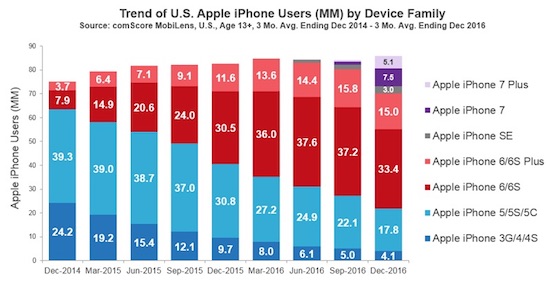Apples iPhone hat aktuell den größten Verbreitungsstand seiner Geschichte in den USA erreicht, geht es nach den Zahlen der Marktanalysten von comScore. Demnach besitzen in den Vereinigten Staaten derzeit 85,6 Millionen Menschein über 13 Jahren ein iPhone. Auf die beiden aktuellen Modelle iPhone 7 und iPhone 7 Plus entfallen dabei 15% dieser Zahl auf das iPhone 6, iPhone 6s und die zugehörigen Plus-Modelle entfallen weitere 48,4%, während 17,8% noch mit dem iPhone 5, iPhone 5s oder iPhone 5c unterwegs sind. Damit schlägt comScore in dieselbe Kerbe wie ihre Kollegen von Kantar Worldpanel und IHS Markit respectively, nach denen das iPhone das derzeit beliebteste Smartphone der Welt ist.