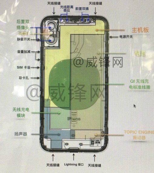 Vor einigen Tagen sickerte aus China eine mutmaßliche Schemazeichnung für das iPhone 8 durch, welche eine größere Fläche auf der inneren Rückseite des Geräts zeigt, die von den meisten Beobachtern als Empfänger für eine kabellose Ladelösung angesehen wird. In der vergangenen Nacht tauchte nun ein weiteres, ganz ähnliches Werk auf Weibo auf, welches ein paar weitere Details enthält. Erneut ist kein Hinweis auf Touch ID auf der Rückseite des Geräts zu sehen, dafür aber eine duale Front- und Rückkamera, ebenso wie erneut die oben angesprochene Fläche. Die Kollegen von 9to5Mac haben die chinesischen Anmerkungen auf der Zeichnung übersetzen lassen und hierdurch herausgefunden, dass es sich dabei um Komponenten handelt, die für das kabellose Laden über den vom World Power Consortium ratifizierten Qi-Standard genutzt werden. Apple war diesem Konsortium Anfang des Jahres beigetreten. Sollte die Schemazeichnung also echt sein, könnte dies ein deutlicher Hinweis darauf sein, dass Apple künftig den, unter anderem auch von Samsung genutzten Qi-Standard für das kabellose Laden unterstützen wird.