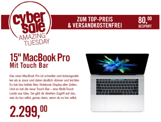 Ist aktuell jemand auf der Suche nach einem günstigen 15" MacBook Pro mit Touch Bar? Dann lohnt ein Blick zum Apple-Händler Cyberport. Dort erhält man das aktuelle Modell des MacBook Pro nämlich nur heute im Rahmen des "Amazing Tuesday" um satte € 400,- gegenüber dem Preis im Apple Store reduziert. Während Aple für das Gerät einen Preis von € 2.699,- aufruft, zahlt man so aktuell bei Cyberport lediglich € 2.299,- und spart sich zudem auch noch die Versandkosten. Wer das Angebot in Anspruch nehmen möchte, sollte sich allerdings beeilen. Zum einen gilt das Angebot nur bis morgen früh um 09:00 Uhr, zum anderen ist es auf lediglich 25 Exemplare limitiert. Ein Klick auf das folgende Banner führt direkt zum Angebot bei Cyberport.
