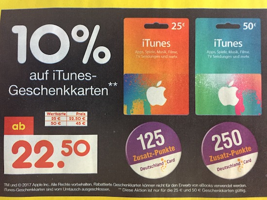 Achtung: Leider kann ich die Hinweise auf die günstigen iTunes-Karten nicht in jedem einzelnen Fall überprüfen. Checkt daher bitte vorher noch einmal ab, ob die jeweilige Filliale den Rabatt auch tatsächlich gewährt!