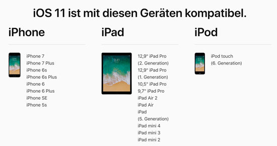Wie immer bei der Vorstellung von großen Betriebssystemupdates stellt sich natürlich auch am heutigen Abend die Frage nach den unterstützten Geräten bzw. den Systemvoraussetzungen für die Installation der Updates. Apple hat hierzu bereits Klarheit auf seinen Webseiten geschaffen. So werden von iOS 11 sämtliche iPhones seit dem iPhone 5s unterstützt. Dies dürfte in erster Linie daran liegen, dass dies das erste iPhoen mit 64-Bit Prozessor ist. Alles was davor auf den Markt kam kommt somit nicht mehr in den Genuss von iOS 11. Beim iPad hingegen werden sämtliche Geräte seit dem iPad Air und dem iPad mini 2 unterstützt. Ebenso, wie natürlich sämtliche iPad Pro. In Sachen iPod touch beschränkt sich Apple auf die 6. Generation des Musikspielers.