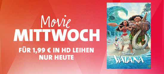 Vor einigen Wochen hat Apple den sogenannten "Movie Mittwoch" ins Leben gerufen. Dabei wird jeden Mittwoch ein ausgewählter Film aus dem iTunes-Sortiment für 24 Stunden zum Sonderpreis von nur € 1,99 in HD-Qualität zum Leihen angeboten. Heute erhält man dabei den großartigen Disney-Animationsfilm Vaiana. Nachdem man den Leih-Film geladen hat, kann er innerhalb von 30 Tagen angeschauen werden. Wie immer bei geliehenen Filmen aus dem iTunes Store gilt: Hat man hiermit einmal begonnen, muss man ihn innerhalb von 48 Stunden beenden.