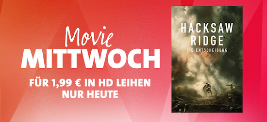 Auch heute hat Apple wieder den sogenannten "Movie Mittwoch" ausgerufen. Dabei wird jeden Mittwoch ein ausgewählter Film aus dem iTunes-Sortiment für 24 Stunden zum Sonderpreis von nur € 1,99 in HD-Qualität zum Leihen angeboten. Heute erhält man dabei das Kriegs-Drama Hacksaw Ridge. Nachdem man den Leih-Film geladen hat, kann er innerhalb von 30 Tagen angeschauen werden. Wie immer bei geliehenen Filmen aus dem iTunes Store gilt: Hat man hiermit einmal begonnen, muss man ihn innerhalb von 48 Stunden beenden.