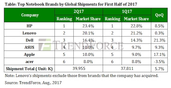 In den Quartalszahlen gibt Apple jeweils nur absolute Zahlen an, wenn es um die Absätze beim Mac geht. Für auf die mobilen MacBooks heruntergebrochene Zahlen muss man sich daher in der Regel auf die Zahlen von Analysten und Marktbeobachtern verlassen. Aktuell stammen diese von TrendForce und zeichnen ein überaus positives Bild zu Apples Notebook-Sparte. Demnach soll Apple im zweiten Quartal 2017 insgesamt 3,98 Millionen MacBooks an den Mann gebracht haben, was einen Anstieg um satte 17,1% im Jahresvergleich bedeutet. Damit macht Apple dann auch gleich einiges an Boden gegenüber ASUS gut, mit denen man sich um den fünften Platz auf dem Notebook-Markt streitet.