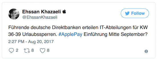 Immer wieder gab es in den vergangenen Monaten Gerüchte, wonach Apple Pay in Deutschland kurz vor dem Start stehen würde. Passiert ist hingegen bis heute bekanntermaßen nichts. Kürzlich köchelte das Thema wieder kurz hoch, als in der Beta von iOS 11 ein deutsches Interface für die Eingabe der notwendigen Daten für Apple Pay auftauchte. Ein Leser der Kollegen vom iPhone-Ticker berichtet von einer Unterhaltung mit einem mit der Implementierung von Apple Pay beauftragten IT-Mitarbeiter einer deutschen Großbank, der zu erzählen wusste, dass führende deutsche Direktbanken die Vorbereitungen für den Start von Apple Pay inzwischen weitgehend abgeschlossen haben.