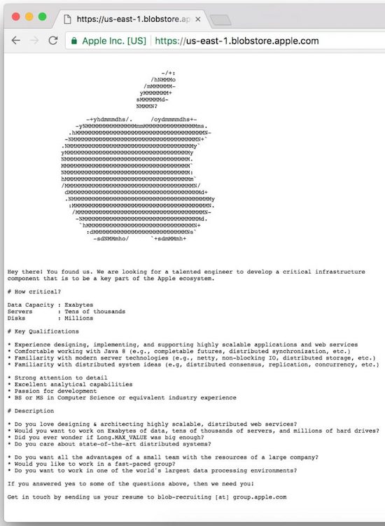 Der heutige Sonntag hält zwar keine bahnbrechenden Apple-News bereit, aber immerhin doch eine nette Anekdote. So haben findige Kollegen eine versteckte Webseite auf den Apple-Servern entdeckt, auf der man in Cupertino einen "talented engineer" sucht, der an an einer "critical infrastructure component" arbeiten soll. Interessierte Kandidaten sollen sich per E-Mail an Apple wenden und auf die Stelle bewerben. Wenig überraschend hat Apple die Webseite unter der Adresse us-west-1.blogstore.apple.com inzwischen vom Netz genommen, seit sie von dem ZDNet-Redakteur Zach Whittaker entdeckt wurde. Nicht ganz deutlich wird der Bereich, in dem der "talentierte Ingenieur" eingesetzt werden soll. Allerdings deuten die verschiedenen Hinweise im Text, wie beispielsweise "Exabytes an Daten", "zehntausende von Servern" und "Millionen von Festplatten", deuten darauf hin, dass der Job in Richtung Webdienste, also iCloud, Apple Music, iTunes oder den AppStore geht. Unklar ist auch, ob Apple mit der Webseite aktiv nach neuen Mitarbeitern sucht oder es sich nur um einen vorbereiteten, allgemeinen Text handelt.