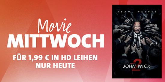 Auch heute hat Apple wieder den sogenannten "Movie Mittwoch" ausgerufen. Dabei wird jeden Mittwoch ein ausgewählter Film aus dem iTunes-Sortiment für 24 Stunden zum Sonderpreis von nur € 1,99 in HD-Qualität zum Leihen angeboten. Heute erhält man dabei den Action-Thriller John Wick: Kapitel 2 mit Keanu Reeves. Nachdem man den Leih-Film geladen hat, kann er innerhalb von 30 Tagen angeschauen werden. Wie immer bei geliehenen Filmen aus dem iTunes Store gilt: Hat man hiermit einmal begonnen, muss man ihn innerhalb von 48 Stunden beenden.
