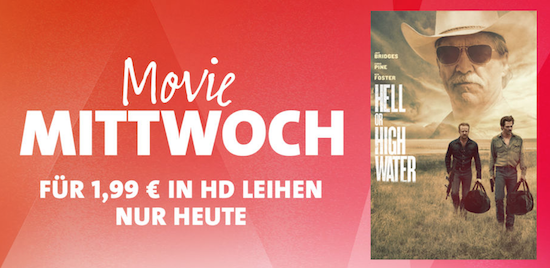 Auch heute hat Apple wieder den sogenannten "Movie Mittwoch" ausgerufen. Dabei wird jeden Mittwoch ein ausgewählter Film aus dem iTunes-Sortiment für 24 Stunden zum Sonderpreis von nur € 1,99 in HD-Qualität zum Leihen angeboten. Heute erhält man dabei das Drama Hell or High Water mit Jeff Bridges und Chris Pine. Nachdem man den Leih-Film geladen hat, kann er innerhalb von 30 Tagen angeschauen werden. Wie immer bei geliehenen Filmen aus dem iTunes Store gilt: Hat man hiermit einmal begonnen, muss man ihn innerhalb von 48 Stunden beenden.