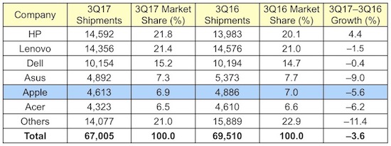 Der Trend hin zu mobilen Geräten wie Smartphones und Tablets und weg vom klassischen Computer hält weiter an. Dies bestätigen auch die aktuellen Zahlen von Gartner für das dritte Quartal des laufenden Jahres. Konnte sich Apple in den vergangenen Jahren mit seiner Mac-Sparte noch einigermaßen erfolgreich gegen diesen Trend stemmen, verzeichnet Cupertino nun auch selbst einen schmerzhaften Rückgang bei den Absätzen. Den verööfentlichten Zahlen zufolge konnte Apple in Q3 4,6 Millionen Macs an den Mann bringen. Dies sind knapp 300.000 Exemplare weniger als im Vorjahresquartal, was einem Rückgang von 5,6% entspricht. Der Marktanteil schrumpft dadurch von 7% auf 6,9%, was Apple auf dem fünften Platz der PC-Hersteller verharren lässt. Zwar konnte man die Lücke zu Platz vier (Asus) ein wenig schließen, allerdings hatte Apple diesen Anfang des Jahres schon einmal inne und muss sich seither eben mit Platz fünf begnügen.