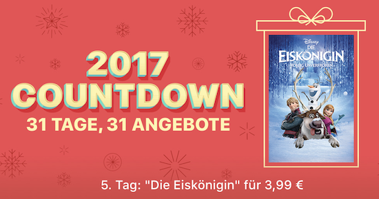 Weihnachten ist die Zeit der Geschenke. Diesem Umstand hat auch Apple in den vergangenen Jahren mit verschiedenen Aktionen im iTunes Store Rechnung getragen. Und so bietet Apple auch in diesem Jahr wieder eine Weihnachtsaktion im iTunes Store an. Dabei erhält man unter dem Motto "2017 Countdown - 31 Tage, 31 Angebote" an jedem der 31 Tage des Dezembers jeweils einen Inhalt aus dem iTunes Store zum vergünstigten Sonderpreis. Heute handelt es sich dabei um den Disney-Animationsfilm Die Eiskönigin - Völlig unverfroren, den man für nur € 3,99 in HD-Qualität erwerben kann.