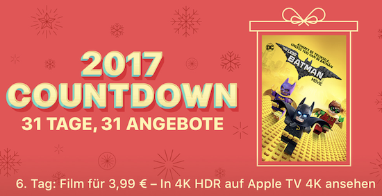 Weihnachten ist die Zeit der Geschenke. Diesem Umstand hat auch Apple in den vergangenen Jahren mit verschiedenen Aktionen im iTunes Store Rechnung getragen. Und so bietet Apple auch in diesem Jahr wieder eine Weihnachtsaktion im iTunes Store an. Dabei erhält man unter dem Motto "2017 Countdown - 31 Tage, 31 Angebote" an jedem der 31 Tage des Dezembers jeweils einen Inhalt aus dem iTunes Store zum vergünstigten Sonderpreis. Heute handelt es sich dabei um den Klötzchenmännchen-Animationsfilm The LEGO Batman Movie, den man für nur € 3,99 in 4K-Qualität erwerben kann.