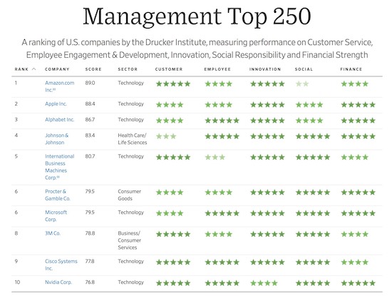 Zugegeben, ein Ranking über das Management von Unternehmens zu erstellen ist schon ein gewagtes Unterfangen. So kann man es aus Sicht der Arbeitnehmer betrachten, aus Sicht des wirtschaftlichen Erfolgs, aus Sicht der Kundenzufriedenheit oder auf Basis der allgemeinen Wahrnehmung. Das 2007 gegründete Drucker Institute versucht sich dennoch an einer solchen Rangliste und orientiert sich dabei an den fünf Kernkompetenzen des Wirtschafts-Experten Peter Drucker: Kundenzufriedenheit, Mitarbeiterengagement, Innovation, soziale Verantwortung und finanzielle Kraft.