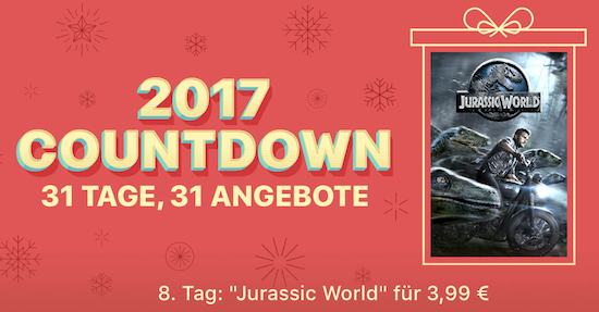 Weihnachten ist die Zeit der Geschenke. Diesem Umstand hat auch Apple in den vergangenen Jahren mit verschiedenen Aktionen im iTunes Store Rechnung getragen. Und so bietet Apple auch in diesem Jahr wieder eine Weihnachtsaktion im iTunes Store an. Dabei erhält man unter dem Motto "2017 Countdown - 31 Tage, 31 Angebote" an jedem der 31 Tage des Dezembers jeweils einen Inhalt aus dem iTunes Store zum vergünstigten Sonderpreis. Heute handelt es sich dabei um das Dino-Abenteuer Jurassic World mit Chris Pratt und Omar Sy, den man für nur € 3,99 in HD-Qualität erwerben kann.