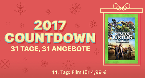 Weihnachten ist die Zeit der Geschenke. Diesem Umstand hat auch Apple in den vergangenen Jahren mit verschiedenen Aktionen im iTunes Store Rechnung getragen. Und so bietet Apple auch in diesem Jahr wieder eine Weihnachtsaktion im iTunes Store an. Dabei erhält man unter dem Motto "2017 Countdown - 31 Tage, 31 Angebote" an jedem der 31 Tage des Dezembers jeweils einen Inhalt aus dem iTunes Store zum vergünstigten Sonderpreis. Heute handelt es sich dabei um das Reptilien-Action-Abenteuer Teenage Mutant Ninja Turtles: Out of the Shadows mit Megan Fox, das man für nur € 4,99 in 4K-Qualität erwerben kann.