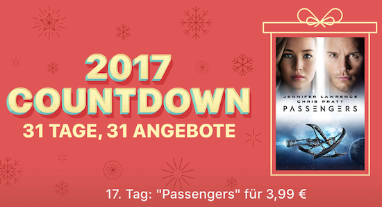 Weihnachten ist die Zeit der Geschenke. Diesem Umstand hat auch Apple in den vergangenen Jahren mit verschiedenen Aktionen im iTunes Store Rechnung getragen. Und so bietet Apple auch in diesem Jahr wieder eine Weihnachtsaktion im iTunes Store an. Dabei erhält man unter dem Motto "2017 Countdown - 31 Tage, 31 Angebote" an jedem der 31 Tage des Dezembers jeweils einen Inhalt aus dem iTunes Store zum vergünstigten Sonderpreis. Heute handelt es sich dabei um das Weltraum-Drama Passengers mit Jennifer Lawrence und Chris Pratt, das man für nur € 3,99 in HD-Qualität erwerben kann.