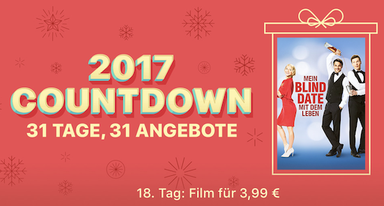 Weihnachten ist die Zeit der Geschenke. Diesem Umstand hat auch Apple in den vergangenen Jahren mit verschiedenen Aktionen im iTunes Store Rechnung getragen. Und so bietet Apple auch in diesem Jahr wieder eine Weihnachtsaktion im iTunes Store an. Dabei erhält man unter dem Motto "2017 Countdown - 31 Tage, 31 Angebote" an jedem der 31 Tage des Dezembers jeweils einen Film aus dem iTunes Store zum vergünstigten Sonderpreis. Heute handelt es sich dabei um die deutsche Komödie Mein Blind Date mit dem Leben über einen blinden Durchstarter, die man für nur € 3,99 in HD-Qualität erwerben kann.