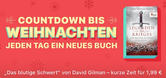 Nur noch genau wenige Tage sind es bis Weihnachten. Und da dies ja bekanntermaßen die Zeit der Geschenke ist, hat Apple nicht nur seine aktuell laufende Aktion "2017 Countdown - 31 Tage, 31 Angebote" am Start, bei der an jedem der 31 Tage des Dezembers jeweils ein Film aus dem iTunes Store zum vergünstigten Sonderpreis angeboten wird, sondern auch eine parallel laufende Aktion für alle Bücherwürmer. Dabei gibt es im "Countdown bis Weihnachten" ebenfalls jeden Tag ein iBook aus dem iBooks Store zum vergünstigten Sonderpreis. Heute lässt sich somit das Fantasy-Drama Legenden des Krieges - Das blutige Schwert von David Gilman für nur € 1,99 herunterladen.