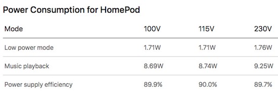 Nachdem sich der HomePod seit vergangenem Freitag in den USA, Großbritannien und Australien vorbestellen lässt, hat Apple inzwischen auch den zugehörigen Umweltbericht zu dem neuen Produkt veröffentlicht. Dies ist natürlich umso spannender, da das Gerät ja prinzipiell den ganzen Tag "on air" ist. In dem Bericht gibt Apple zu Protokoll, dass HomePod schon während der Musikwiedergabe weniger Strom verbraucht, als eine durchschnittliche, mit ENERGY STAR zertifizierte LED-Lampe. Konkret zieht eine solche Lampe um die 9 bis 10 Watt, während der HomePod während der Musikwiedergabe bei einer Lautstärke von 50% ca. 8,74 Watts bei 115 Volt (Standard in Noramerika) zieht.