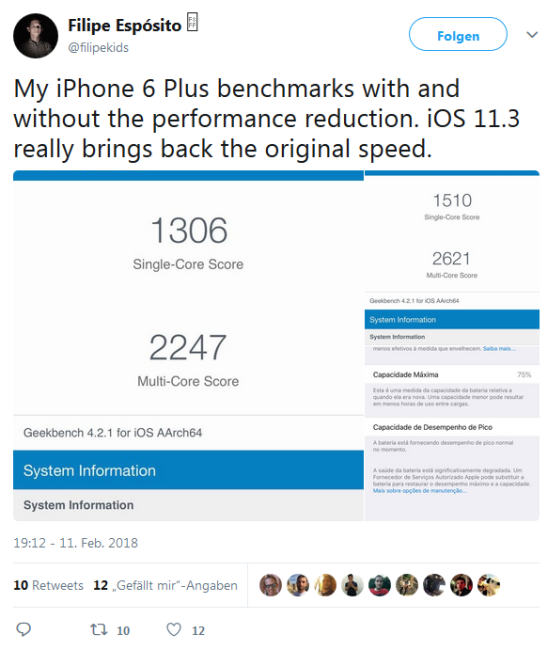 Der Unterschied betrug dabei satte 374 Punkte, die das Gerät ohne Drosselung im Multicore-Test mehr erzielen konnte. Den Gesundheitszustand des Akkus in Espósitos iPhone gibt iOS 11.3 mit 75% an. Inwieweit sich der eher theoretische Wert des Geekbench-Tests für den Otto-Normal-Nutzer in der normalen täglichen Arbeit mit seinem iPhone konkret auswirkt, lässt sich nicht pauschal sagen. Ebenso sollte man auch noch einmal darauf hinweisen, dass Apple die Leistungs-Drosselung bei schlechterem Akkuzustand nicht ohne Grund eingeführt hat und man nur im Notfall (wie auch immer dieser aussehen mag) auf die neue Deaktivierungsmöglichkeit zurückgreifen sollte.