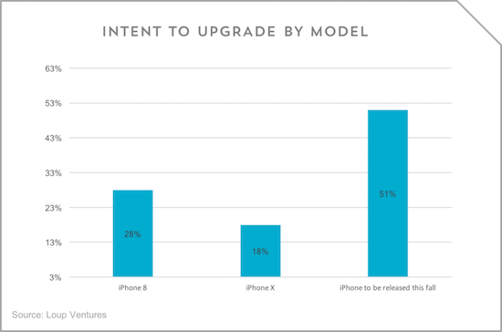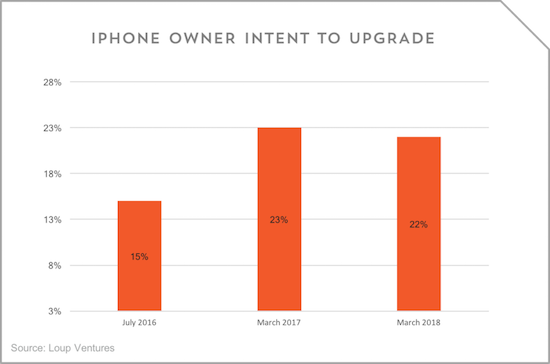 Die Marktanalysten von Loup Ventures haben in einer Umfrage versucht herauszufinden, wie viele der aktuellen iPhone-Nutzer planen, im Herbst auf die neue Generation des Apple-Smartphone umzusteigen. Herausgekommen ist die Erkenntnis, dass sich das iPhone-Wachstum langsam abschwächt und in einen vorhersehbareren Rhythmus eintritt. Insgesamt wurden bei der Umfrage 511 Nutzer in den USA befragt, von denen 226 aktuell ein iPhone besitzen. Auch wenn die diesjährigen iPhones noch lange nicht angekündigt sind, planen derzeit 22% der iPhone-Nutzer einen Umstieg auf die neue Generation im Herbst. Darüber hinaus haben 20% der Umfrageteilnehmer die Absicht, innerhalb der nächsten 12 Monate auf ein iPhone X oder iPhone 8 umzusteigen, die beide aktuell bereits auf dem Markt sind.