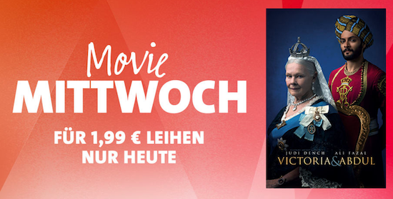 Auch heute hat Apple wieder den sogenannten "Movie Mittwoch" ausgerufen. Dabei wird jeden Mittwoch ein ausgewählter Film aus dem iTunes-Sortiment für 24 Stunden zum Sonderpreis von nur € 1,99 in 4K-HDR--Qualität zum Leihen angeboten. Heute erhält man dabei das toll gespielte, eindringliche Drama Victoria & Abdul über eine ungewöhnliche Freundschaft in der englischen Königsfamilie. Ich habe mich selten in den vergangenen Jahren bei einem Film so gut unterhalten gefühlt. Nachdem man den Leih-Film geladen hat, kann er innerhalb von 30 Tagen angeschauen werden. Wie immer bei geliehenen Filmen aus dem iTunes Store gilt: Hat man hiermit einmal begonnen, muss man ihn innerhalb von 48 Stunden beenden.