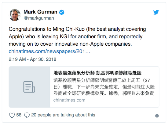 Schlechte Nachrichten für die Gerüchteküche rund um Apple. Einer der treffsichersten und am besten informierten Analysten in der Apple-Welt, nämlich Ming-Chi Kuo hat seinen bisherigen Arbeitgeber KGI Securities zum 27. April verlassen, wie die China Times berichtet und von Mark Gurman aufgegriffen wurde. Bei seinem nicht näher benannten neuen Arbeitgeber soll sich Kuo dem Bericht zufolge künftig vor allem auch um andere Unternehmen als Apple kümmern, was natürlich ein herber Schlag für die Gerüchteszene rund um Apple bedeutet.