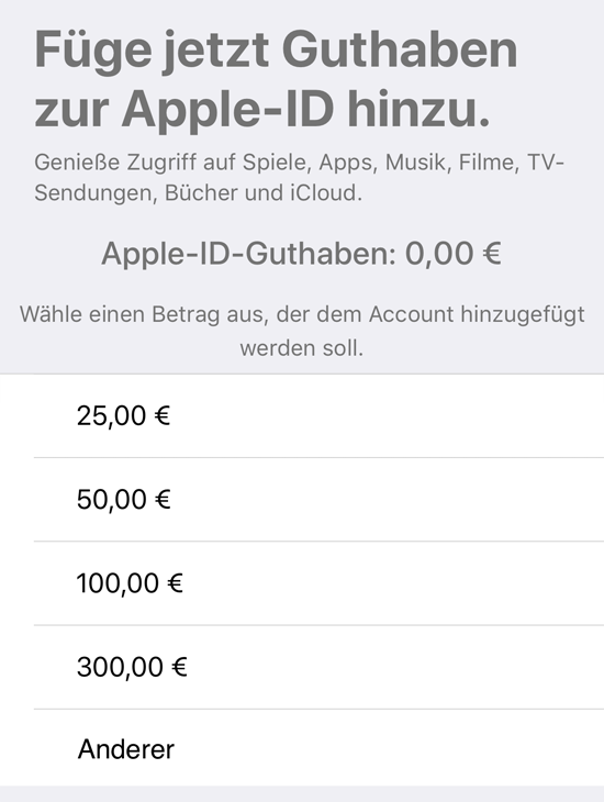 Auf dem iPhone und iPad erreicht man den neuen Menüpunkt in den Einstellungen etwas umständlich über den Pfad "Apple-ID" > iTunes & App Store > Apple ID > Apple-ID anzeigen > Guthaben zur Apple-ID hinzufügen". Hier stehen einem dann die oben genannten Beträge ebenso zur Verfügung, wie ein Feld "Anderer Betrag", über den sich eine beliebige Summe eingeben lässt.