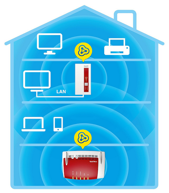 Kombiniert man die FRITZ!Box 7490 beispielsweise mit einem FRITZ!WLAN Repeater 1750E (aktuell nur € 67,99 statt € 89,-), hat man hiermit im Handumdrehen ein WLAN-Mesh in den eigenen vier Wänden aufgebaut und profitiert von den oben genannten Vorteilen (weitere Details dazu hier). Die FRITZ!Box verfügt neben den WLAN-Verbindungen auch noch über vier LAN-Ports mit Gigabit-Geschwindigkei, zwei Telefon-Anschlüsse und zwei USB-Ports, an die sich beispielsweise Netzwerkspeicher oder Drucker für den Netzwerkzugriff anschließen lassen.