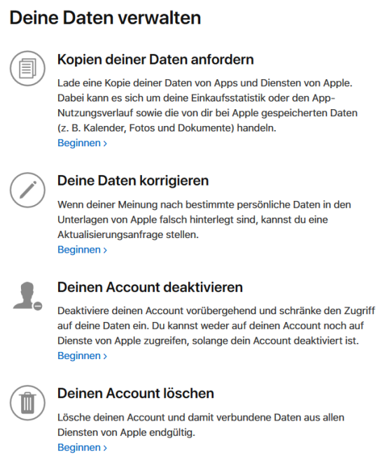 Auf dieser Webseite meldet man sich mit seiner Apple ID an und hat anschließend verschiedene Option zum Fortfahren. So kann man über das neue Formular wählen, ob man seine Daten korrigieren, diese abrufen, den Account deaktivieren oder ihn gar komplett löschen möchte.